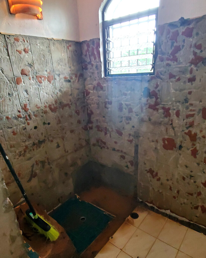 The Japanese tub, with two benches facing each other was the first thing that had to go. It was quite a challenge for Henry as the wall and benches turned out to be solid concrete. My house was full of cement dust for over a week as they hammered/chipped away at it. Eventually the space was cleared out and it was time to begin tiling.