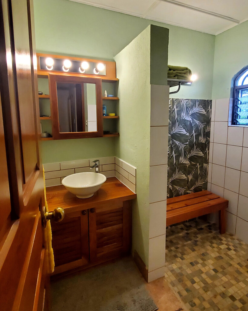 I mocked up photos of the bench I wanted for the shower stall and the new countertop and doors for the sink. I presented them to Luis who has done all the woodwork so far in my house and gave him the job. By the time the tiling of the shower stall was done Luis had completed the woodwork and we began removing the concrete counter and clearing out the space for the new sink.